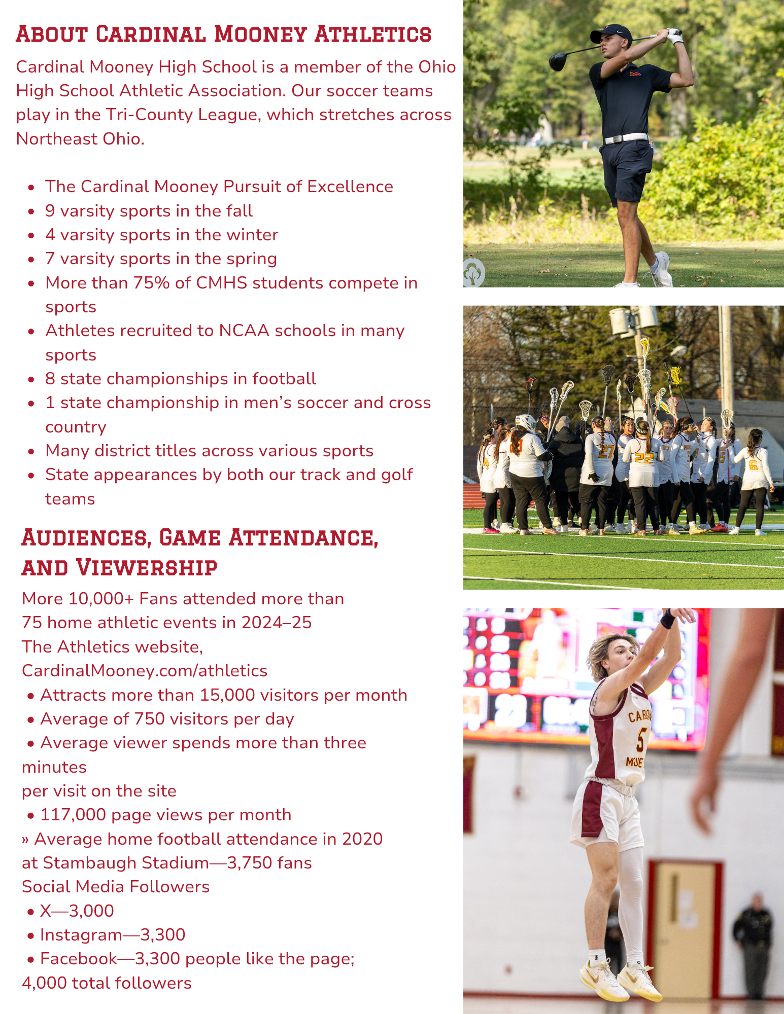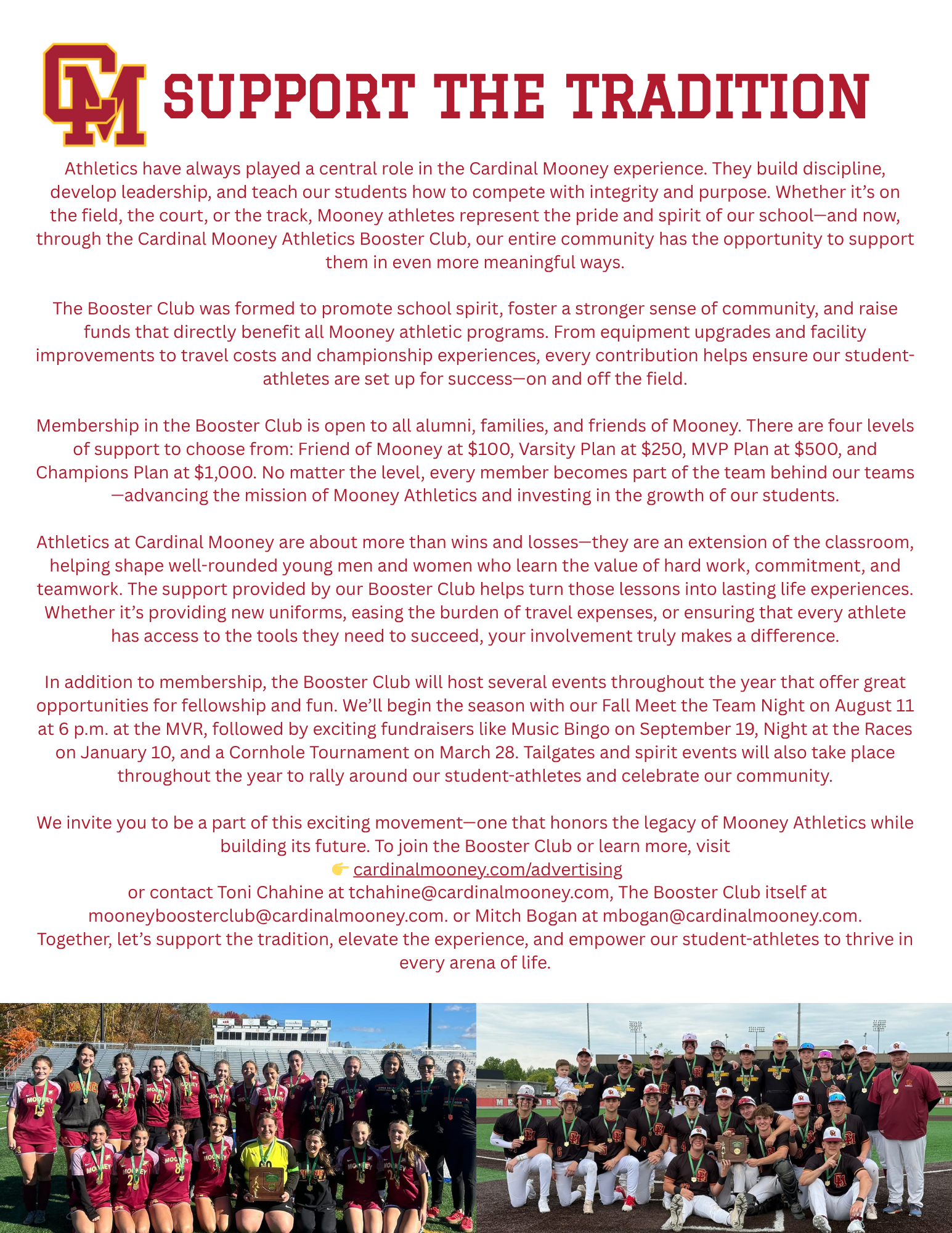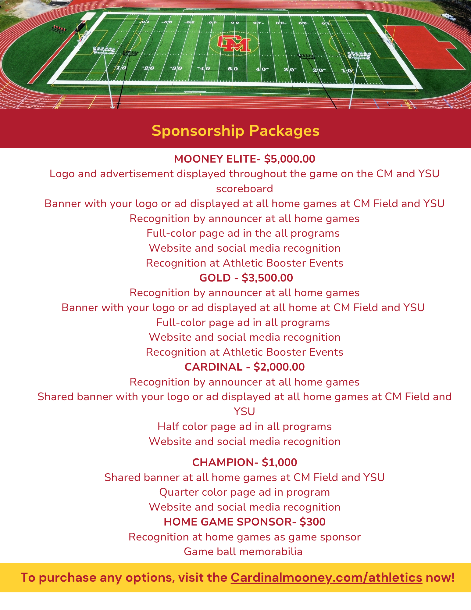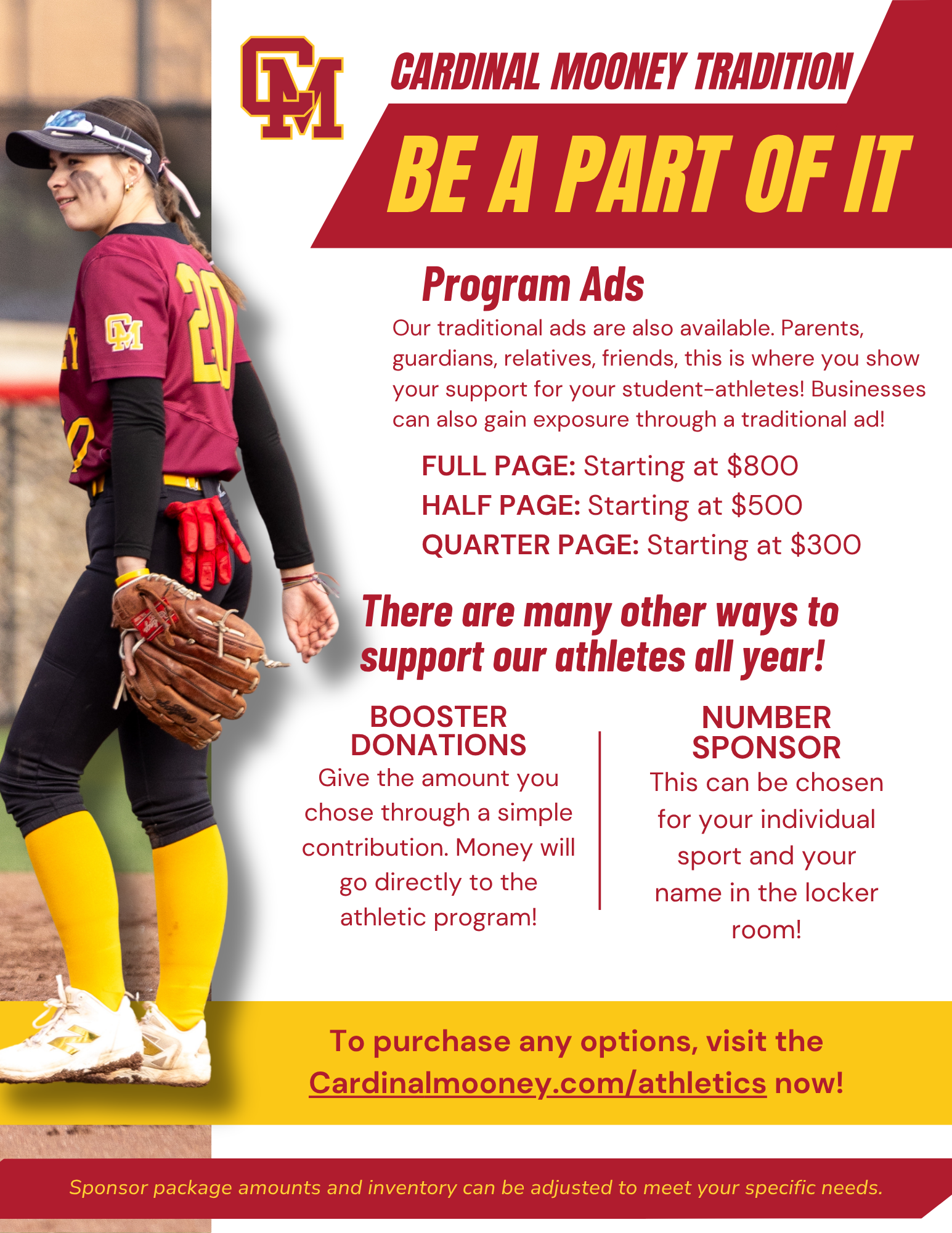 Now Accepting Ads and Sponsorships for Cardinal Mooney Athletics! by Mitchell Bogan | Jul 11, 2025 | Athletics, News For more information about our advertising options, please click on the flyer. Program Advertisement Form Sponsorship Packages Form If you have any questions: Call: 330-788-5007 Toni Chahine – tchahine@cardinalmooney.com Mitch Bogan – mbogan@cardinalmooney.com