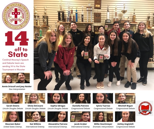 Every year at this time, the Cardinal Mooney Speech and Debate team gets hit hard with the reminder that its students and coaches sit on the shoulders of giants. In 1965, Denny Barrett won the first of his four state titles, and in 1989 and 1992, Diane Mastro Nard added two more. This year, at Wooster High School, the program sends 14 to the state tournament, the most of any team in the Diocese of Youngstown.