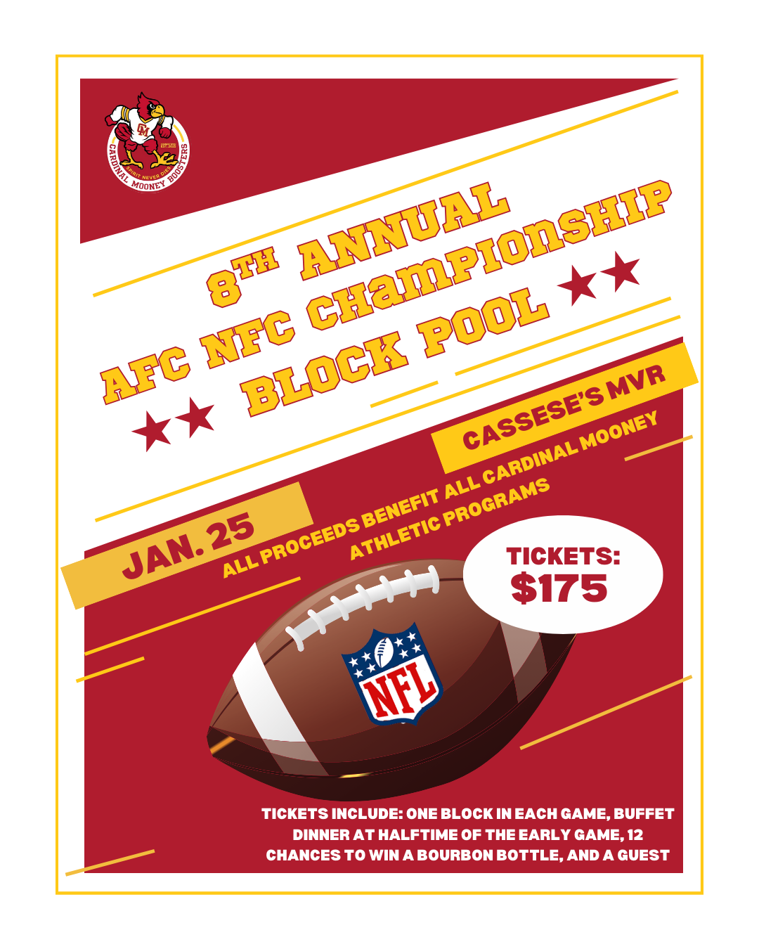 Join Cardinal Mooney Athletics for the 8th Annual Championship Sunday Block Pool at Cassese’s MVR, featuring the AFC and NFC Championship games. All proceeds benefit Cardinal Mooney Athletic Programs. Tickets include one block in each game, a buffet dinner at halftime of the early game, multiple chances to win prizes, and a great championship-day atmosphere. Don’t miss this exciting community fundraiser in support of our Cardinals.