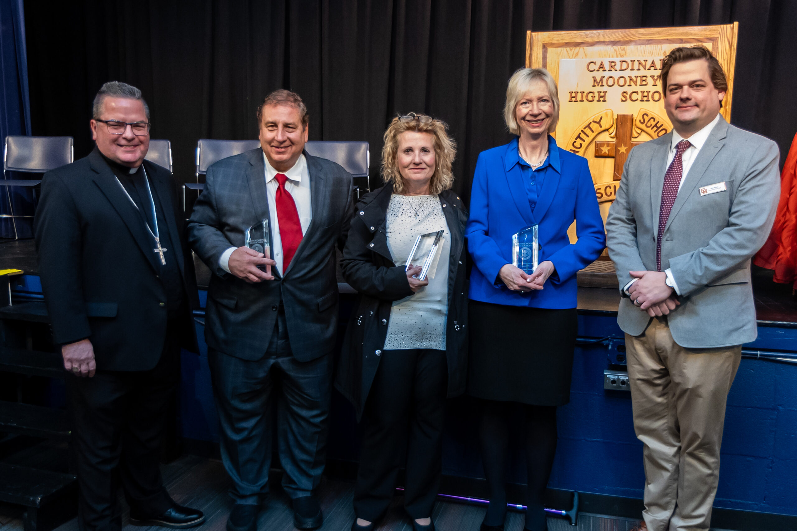 On Thursday, Jan. 31, Cardinal Mooney High School inducted its Class of 2025 Distinguished Alumni. Pictured, from left, are Bishop David Bonnar, Dr. Bill Begalla, Class of 1974; Susan (Colucci) Centorame, Class of 1975, who inducted her husband, Ken Centorame, Class of 1971, posthumously; Carol Fortine Ochoa, Class of 1976; and Cardinal Mooney president and principal, Nick Beyer.