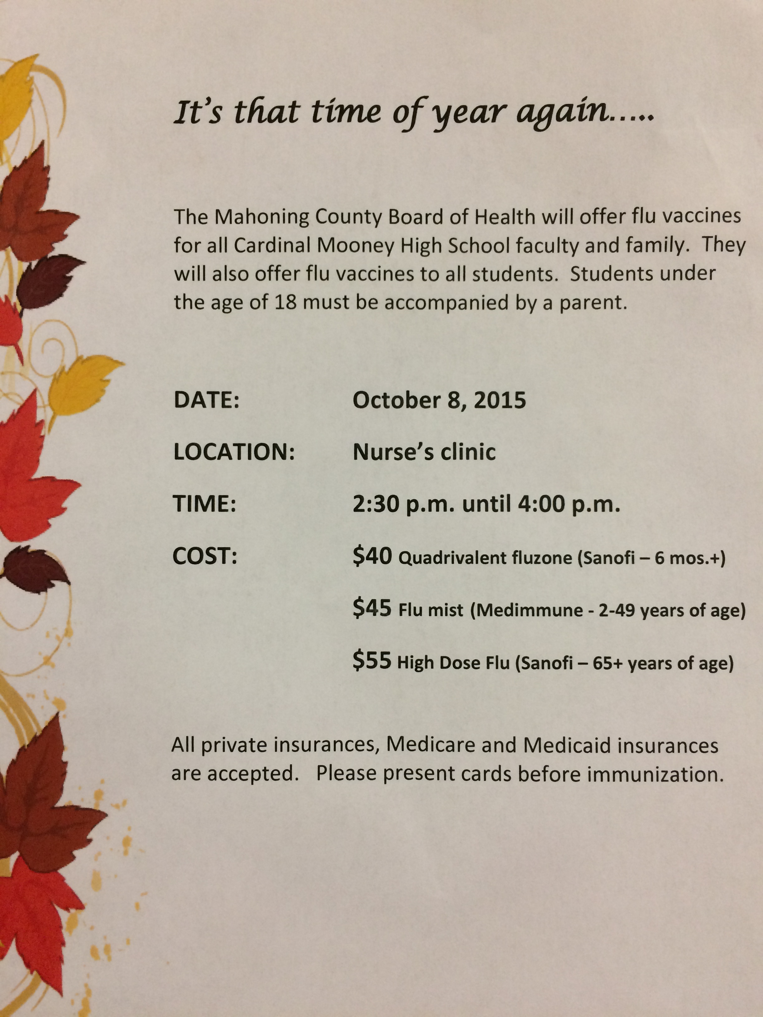 We will be offering flu vaccines for all Mooney Faculty and students on October 8, 2015 from 2:30-4:00 p.m. Students under the age 18 must be accompanied by a parent or guardian. The cost is: $40 for the Quadrivalent fluzone (Sanofi-6 mos.+)