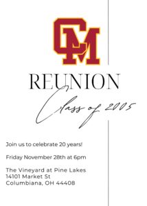 Browse Alumni Alumni Newsletter Alumni Spotlight Cardinal Mooney Veterans Distinguished Alumni Reunions & Events Transcript Requests Alumni Contact Reunions & Events Class of 1960 - Reunion August 9, 2026 at Ala Cart Contact Carole Garchar for more information. 330-758-4612 or Cell: 330-360-4521 Class of 2005 - 20th Reunion