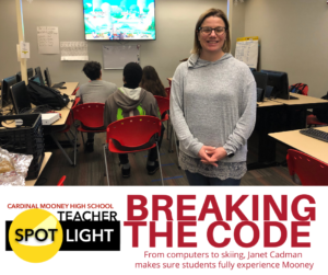It’s been said that the best ability is availability. On the faculty and staff section of CardinalMooney.com, teacher Janet Cadman is listed in the Business department … but that doesn’t come close to describing her contribution to the school. Currently, she is the co-advisor with Mrs. Tina Hughes on Link Crew, Student Government, Junior and Senior Class Advisor, and Rally Advisor. She is also the co-advisor of the YESFest with Mrs. Mastrianana. And, as if her schedule isn’t filled enough, she is also the advisor on the Ski Club. Next up … building the cornerstones of a Video Game Club. “I am always looking for new clubs to bring to Mooney for the students. Making sure that the students have a wonderful high school experience where they can look back and say “I was involved” really drives me,” Cadman said. “During my high school years, I did not get involved. I was in marching band, symphonic band, French and Latin club and that was it. I want to make sure that students have the opportunity to be involved in something they are interested in.” This is a lot of work, and the overarching motivation for Cadman is the same that has driven so many people who have walked through Mooney’s halls. “What separates Mooney from all other schools is the Mooney Family,” she said. “The Mooney family is a real thing — not only with the alumni, but I see it with the students every day. They are interested in how you are doing. They care about you.” Clubs and activities are essential for a school, but during school, Cadman is leading a Computer Coding class — something not offered in a lot of schools. With Mooney’s block scheduling, she is able to fit in a lot material, a really give students a unique experience. “Coding came to Mooney about 4 years ago — I realized that our students needed to learn this skill,” she said. “Computer science is in everything they will be doing. Making sure our students have this knowledge will only give them an advantage when they go out in the ‘real world’.” Cadman added that one big challenge to leading the class is staying ahead of the advancing coding skills the students gain every day. While she is excited to blaze a trail in a new subject, it’s still the basic elements of teaching that keep her so engaged. “The most rewarding part of my job is seeing how excited students get when they finally get a new concept they have been learning in class — seeing the final projects the students have been working on and when they show off their work,” she said. “I get excited when I walk around and see students working in groups figuring out a new code, a new program, or listening to the students talk through problems in class and seeing the lightbulb go off above their heads and realizing they are understanding what we are learning in class is such a great feeling.” Cadman is an Austintown Fitch graduate. She got her Bachelor of Fine Arts degree in Photography with a minor in Art Education from Youngstown State University. Her next step was at Walsh, where she earned a Master’s in Art Education. She returned to YSU to pick up a Master’s of Science in Educational Technology. She is currently attending Cleveland State University to pursue an Administration License.